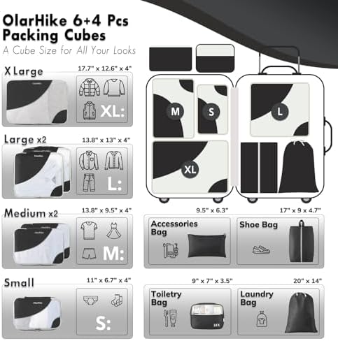 Perfect Fit for All Travel Needs: 6 different sized packing cubes, 1x toiletry bag, 1x laundry bag, 1x shoe bag, 1x accessory bag, for essentials like jackets, shirts, shoes, pants, underwear, toiletries, and more. Laundry bag keeps soiled clothing separate.