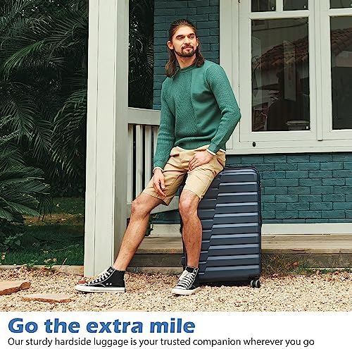 ABS+PC material, durable and lighter hard shell, features textured finish to prevent against scratches. The beveled edge design on the upper part increases toughness for the luggage.