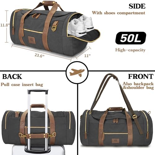【Large Capacity & Shoes Compartment】The size is (L)23.6 x (W)11 x (H)11.8 inches, the interior space is spacious enough, the capacity of 50L can hold a 17-inch laptop and 5-7 days of daily necessities. The side shoes compartment design is convenient for storing shoes, toiletries, etc., making this duffle bag very practical.