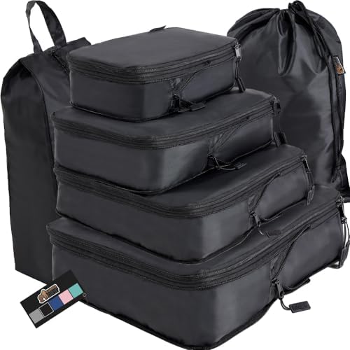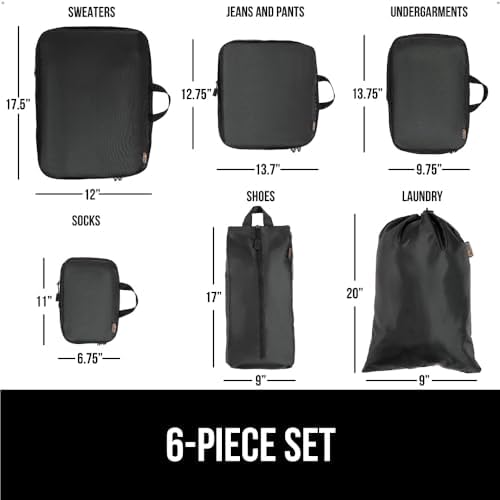 6 PIECE SET: this 6 piece set features cubes for heavy items like jackets and sweaters, but also cubes for smaller lightweight items like shirts and undergarments; a laundry bag and shoe bag are also included to keep dirty items away from the clean
