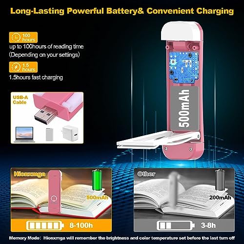 [USB Rechargeable &Long Lasting]:The built-in USB charging port design makes charging very convenient,simply plug it into a power bank,laptop,phone adapter,car charger,etc. This reading lights for books in bed has a 500mAh battery,providing 8-100 hours of reading time (depending on your settings).