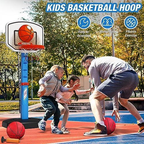 STURDY DESIGN – HYES 2 in 1 kids basketball hoop & t-ball sets are made of non-toxic and durable material, safe for kids. You can add water or sand to the base, and put a sandbag or other heavy objects on the base to increase stability. It is a great indoor & outdoor toys for kids ages 3+.
