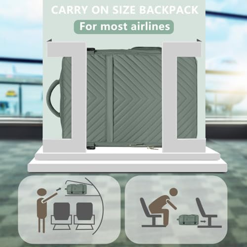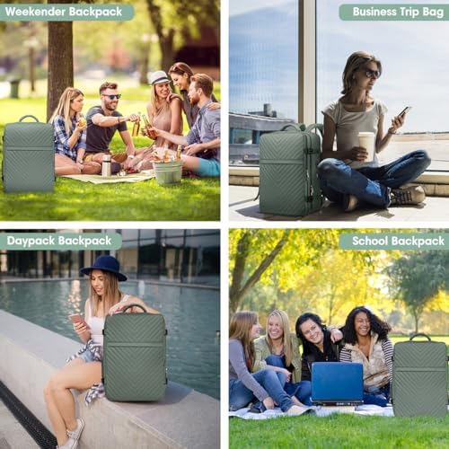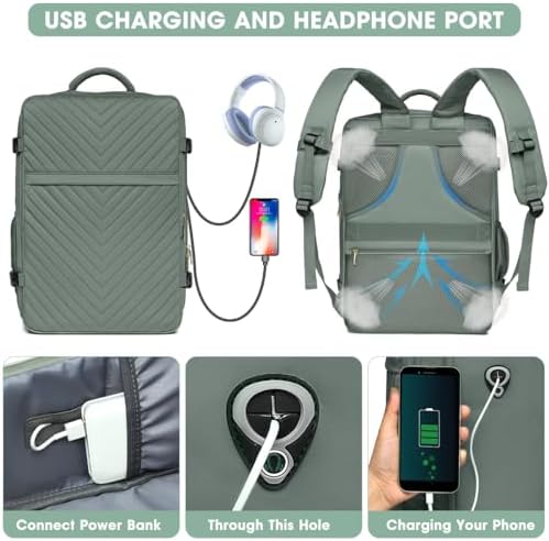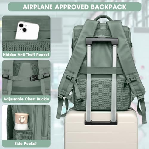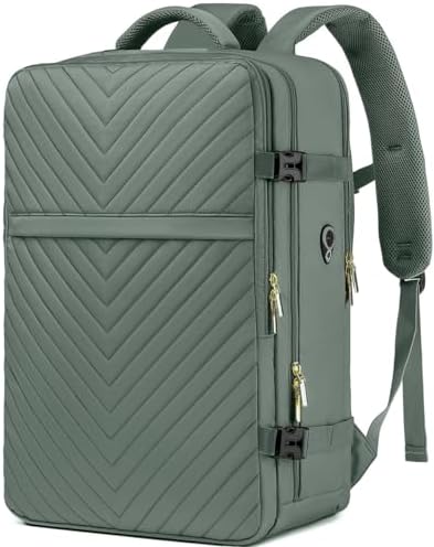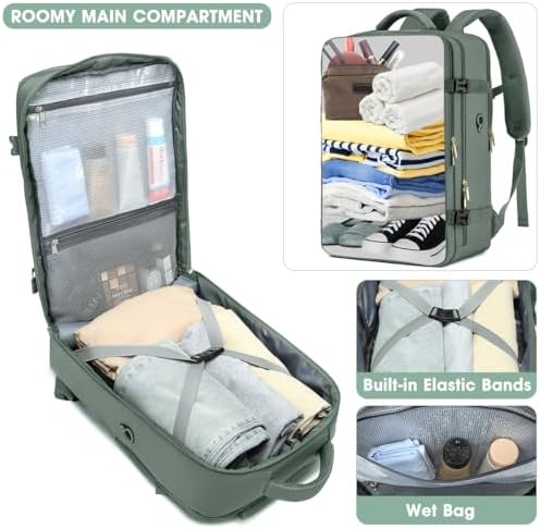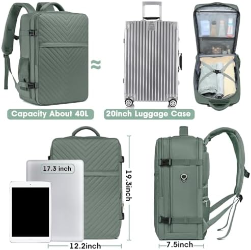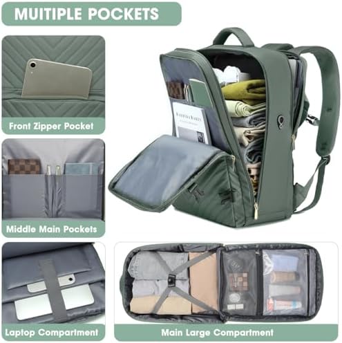 🛶Airplane Approved Travel Backpack – The dimension of green backpack is 19.3 x 12.2 x 7.5 inch. Perfect size for airline approved. 2.56 lbs weight. The capacity is 40L. You can board the plane with this water resistant travel laptop backpack as a personal item and save on paying any extra baggage fees. Two laptop compartments for 13-inch ipad and 17.3-inch laptop. One expanding side pocket for water bottle or an umbrella. The front compartment has many pockets to keep your belongings organized.