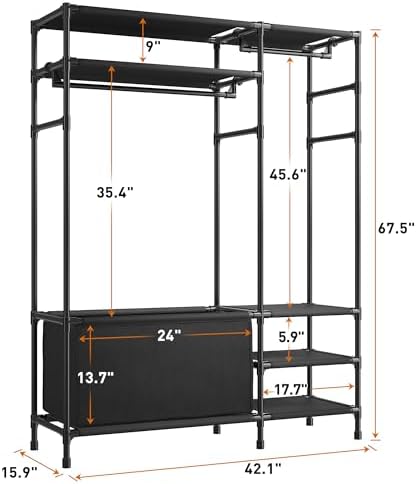 【Space Saving Clothes Rack】Size: 15.9”L x 42.1″W x 67.5″H. The clothes racks for hanging clothes make the best use of limited space and keep your room clutter-free and organized. The combination of tiered area hanging pole hanging area can not only make your room more tidy, but also meet your diverse need. Whether your home style is traditional or modern, this portable clothes rack will blend in perfectly with your home style. Perfect for the corner of your bedroom, living room, entryway. You can hang up all the clothes of your family. Maximize the space to place your stuff and keep your home clean all the time.