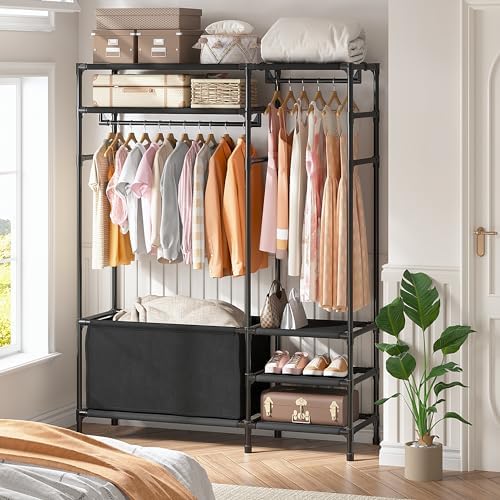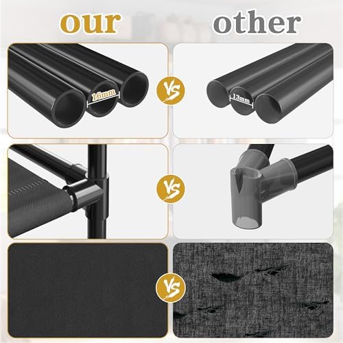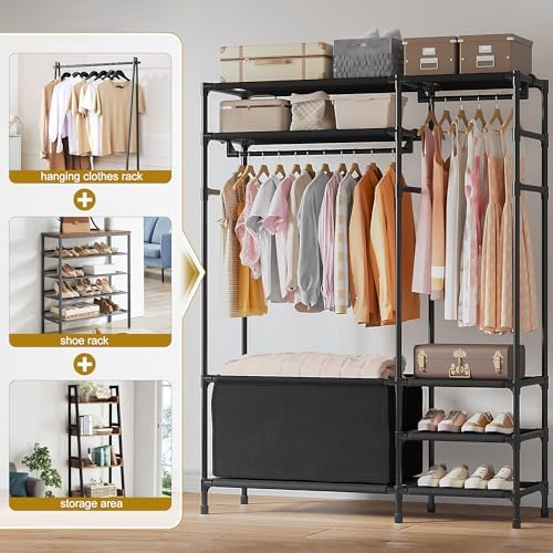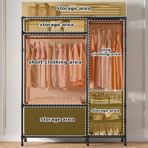 【Robust and Durable】Built with thick metal tubes and quality plastic connectors, this clothing rack with shelves is sturdy and stable enough to hold up to 100LBS. Thickened non-woven fabric provides strong support for your clothes, with strong bearing capacity and is not easy to deform.