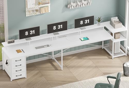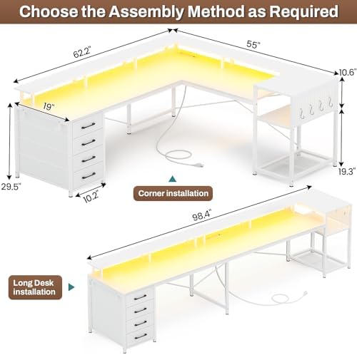 【Convertible Design】The l-shaped gaming desk can be changed into a long two-person desk as you need. The 98.4-inch – length size allows two people to work side by side without compromising on space. The double office desk is perfect for your friends, workmates and you to study, play games, and work together. The drawers can be placed left or right as your needs.