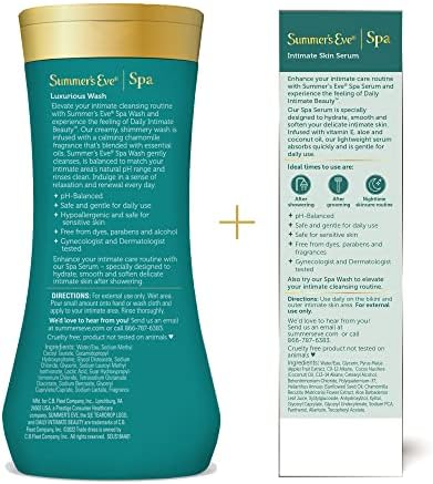 Gift Set contains 1 bottle of Summer’s Eve Spa Daily Intimate Wash (12 oz) & 1 tube of Summer’s Eve Spa Daily Intimate Skin Serum (1 oz)