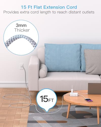 Flat Plug Power Strip Surge Protector with 15 Ft Long Cord, Flat Extension Cord with Multiple Outlets and USB Ports
