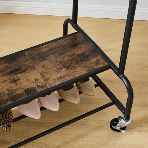 👜【Multifunctional Clothes Hanger】With 6 hooks and 4 anti-slip beads on both sides of the double rod clothing rack, it provides the perfect storage place for hats, scarves and bags. The wooden shelf of the garment rack can hold boxes, folded clothes, and the bottom shelf can hold your assorted shoes.