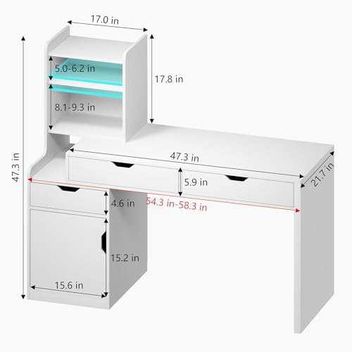 [EASY TO ASSEMBLE]: Overall size of this computer desk: 21.7″D x 54.3″-58.3″W x47.3″H. This home office desk comes with detailed installation instructions and all necessary hardware& tools. You can effortlessly assemble this desk. If you have any question about this computer desk with 3 drawers & 3 open shelves, please feel free to contact us.