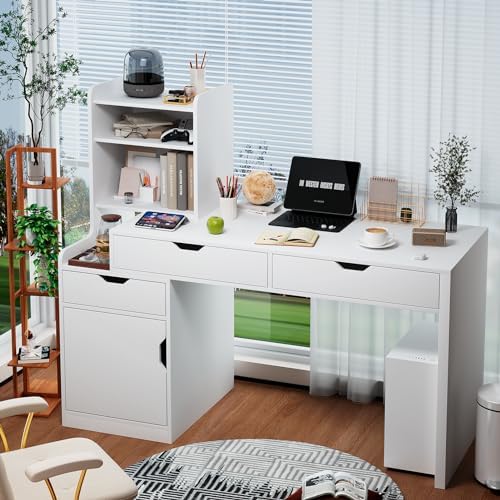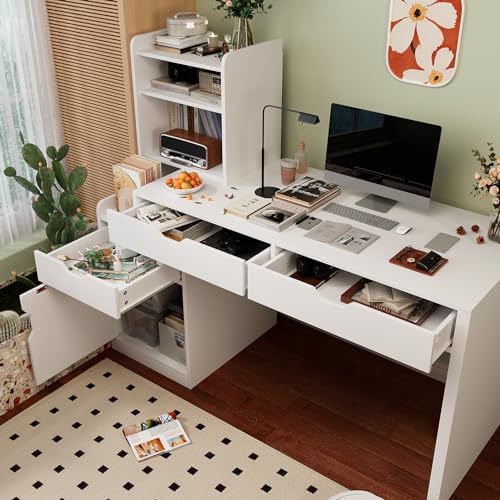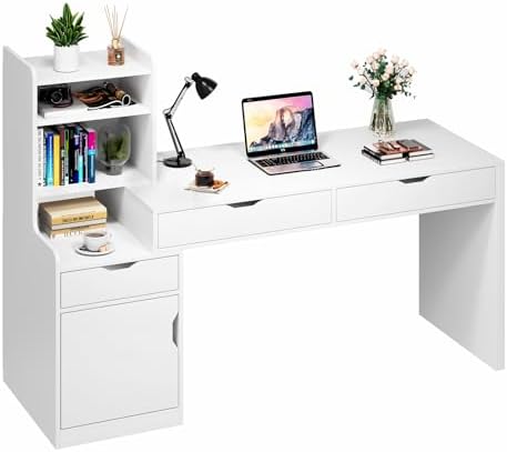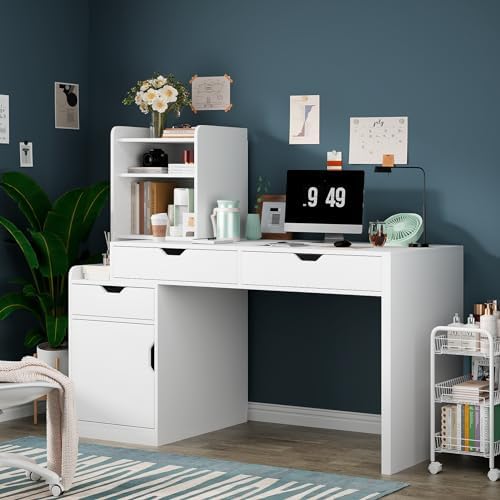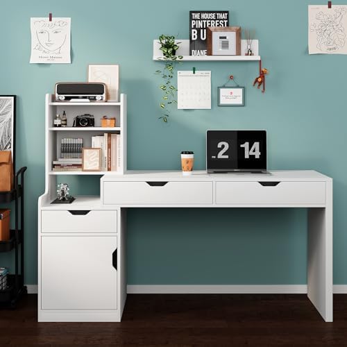 [MULTIPLE USAGE]: YOMILUVE computer desks features the white engineered wood board design and boasts a modern and confident style, which fits perfectly with home office furniture creating an efficient and comfortable working atmosphere. Plus, the overall length of the desk can be flexibly adjusted from 54.3″to 58.3″, which is suitable for the size of different venues: home office, study room, living room, bedroom.
