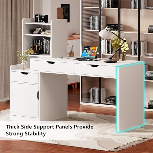 [DURABLE & STURDY]: This office desk with open shelves, drawers, and cabinet is manufactured with high quality MDF Board, which is scratch & dust resistant, waterproof and easy to clean. The tabletop and side racks are constructed by sturdy engineered wood board, providing a stable structure and ensuring a long service time.